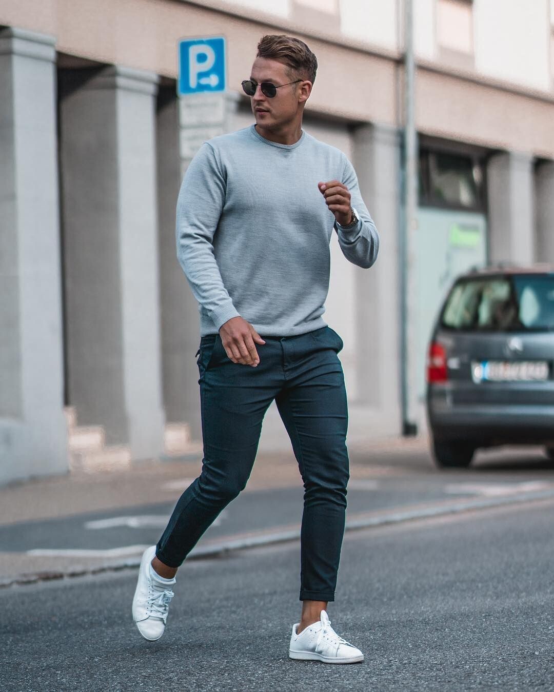 As shown here, blue really is one of those colors that allows you to mix and match different shades without it looking too overwhelming. Feel free to swap out the navy sweater for one in black or charcoal for an equally stylish look.