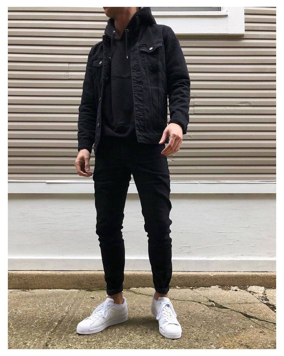 Going for an all-black athleisure look never fails to impress and the addition of a black trucker jacket adds some bonus style points (and insulation). Also, got to love the white low tops (and no-show socks) which contrast nicely with the darkness of the rest of the outfit.